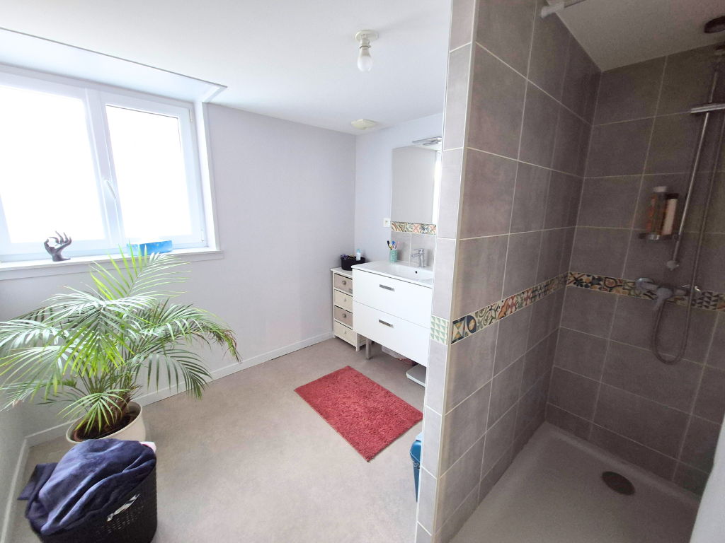 Salle salon, cuisine meublée et équipée (hotte, plaque de cuisson, four) salle de bains avec douche italienne, deux chambres - cellier et WC séparé.