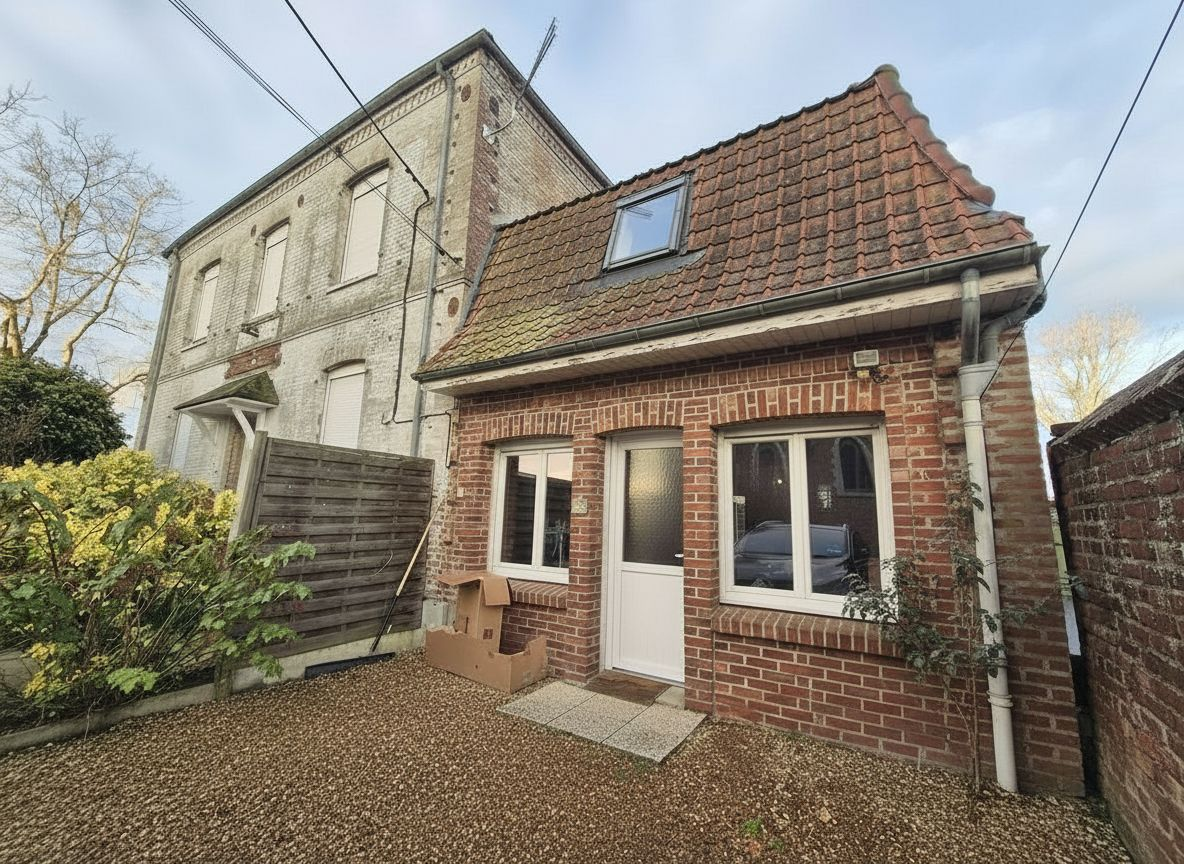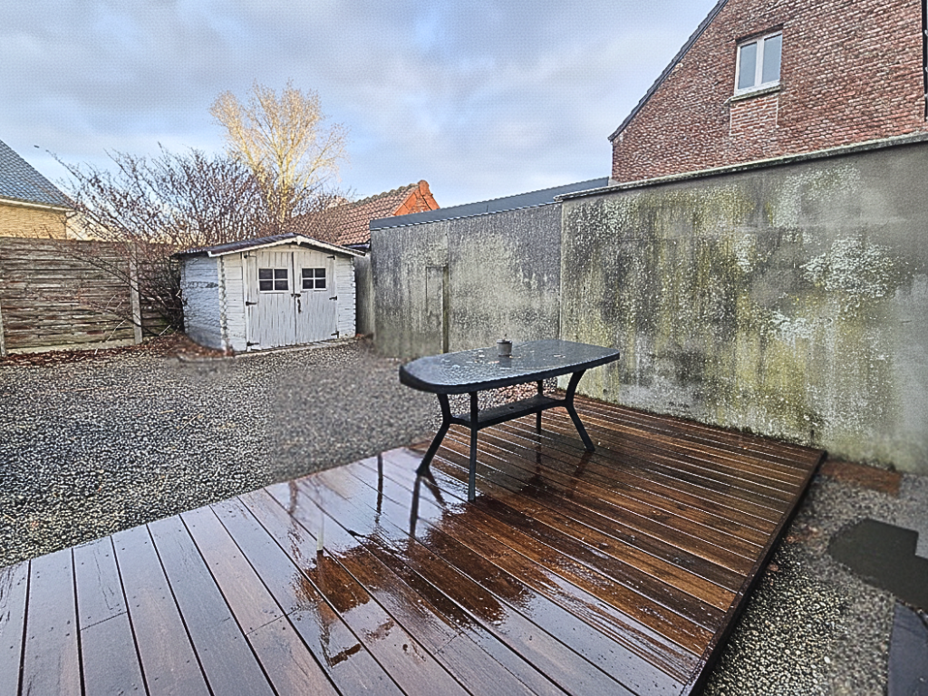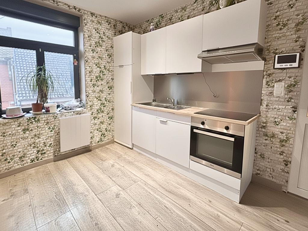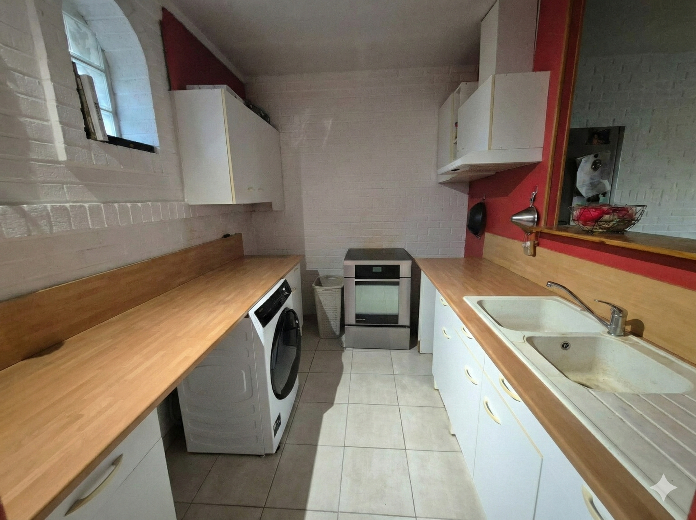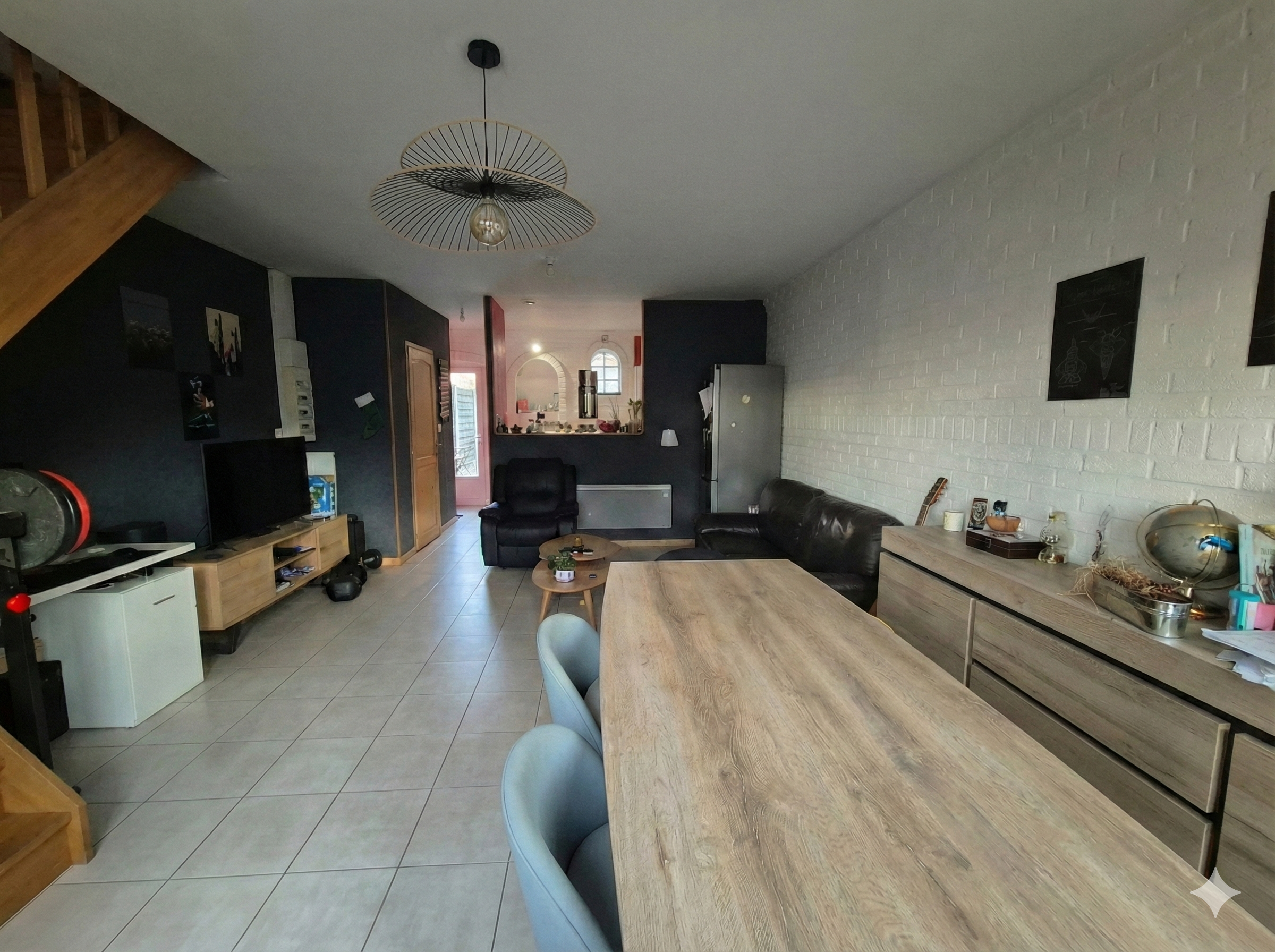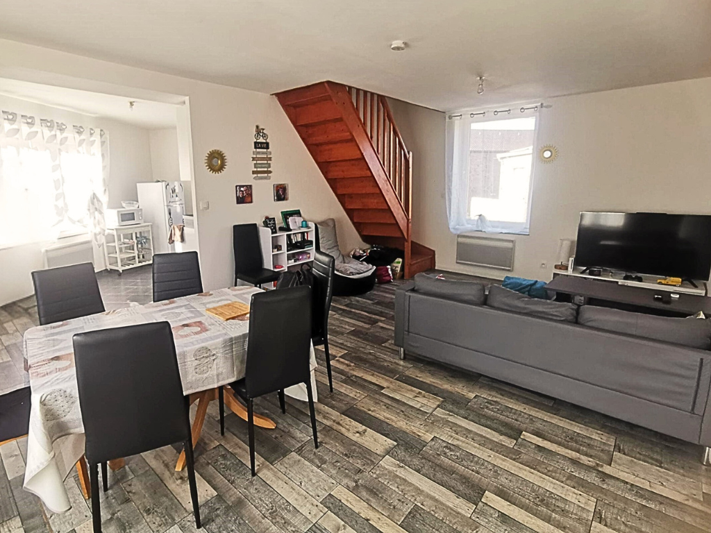 Au rez-de-chaussée : salon-séjour ouvert sur cuisine meublée et équipée (hotte et plaque de cuisson), un WC.