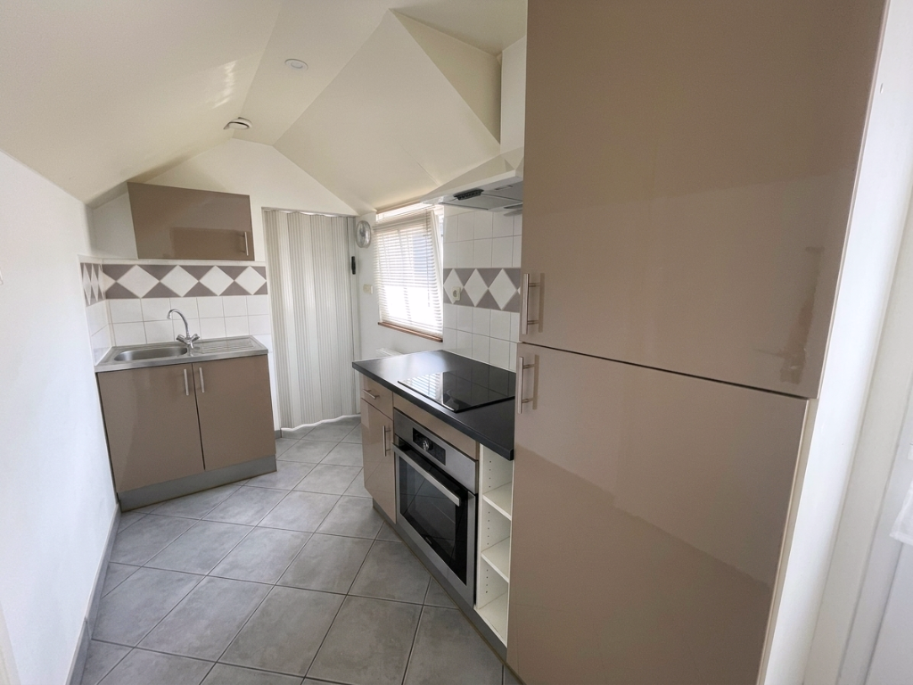Salle salon, cuisine meublée et équipée (hotte, plaque de cuisson, four et frigo), salle de bains avec douche, WC.