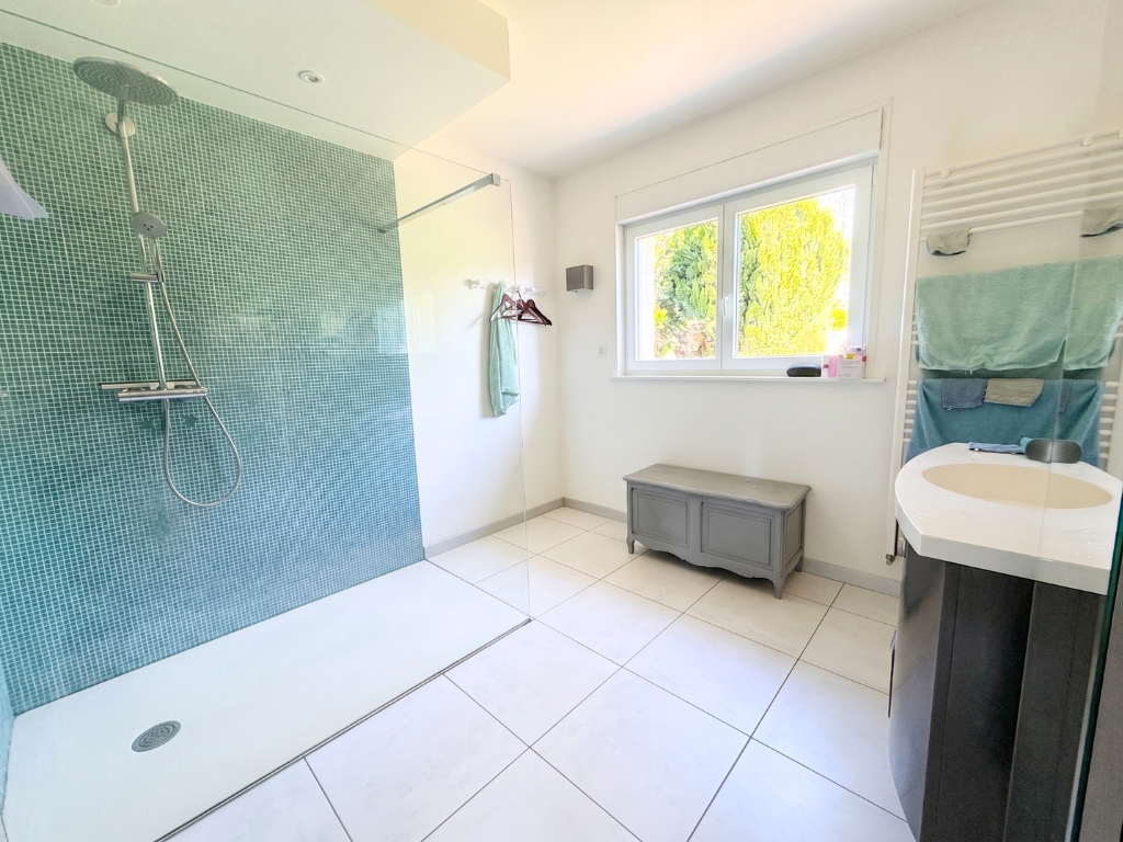 Un hall en toit cathédrale, un espace de vie ouvert sur une cuisine équipée, 2 salles de bains, 3 chambres et une salle de jeux de 44m² pouvant être divisée en chambres supplémentaires.