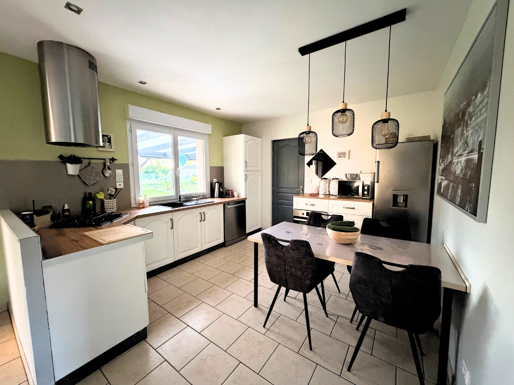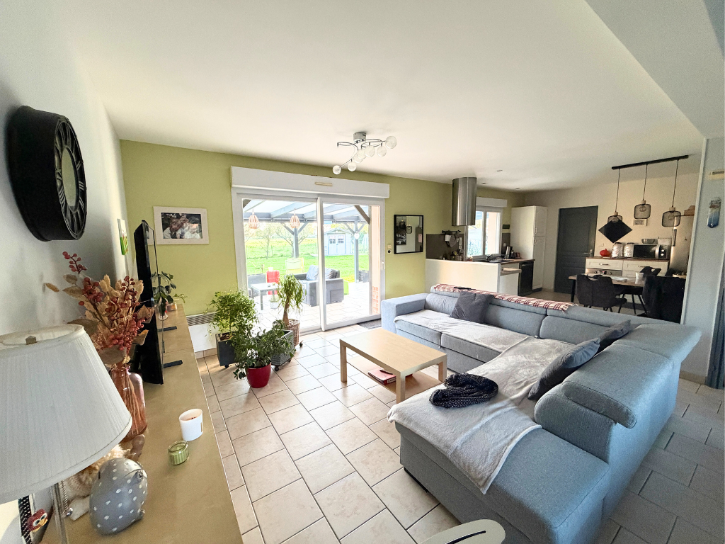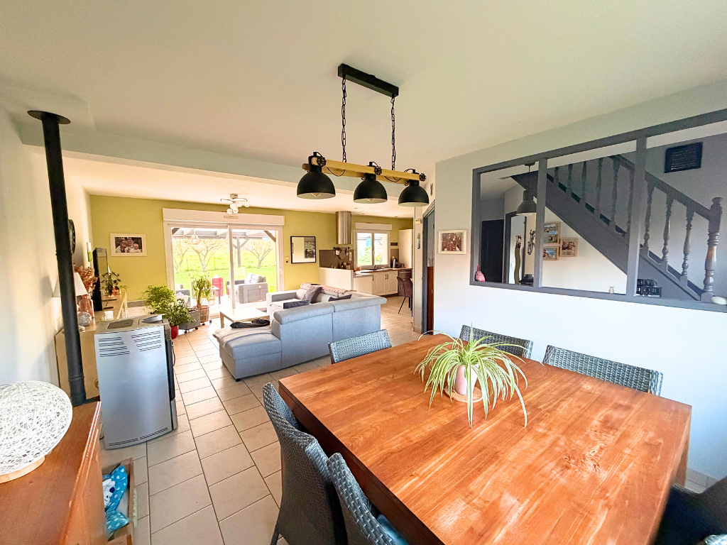 Un hall d'entrée qui dessert un salon séjour avec poêle à pellets ouverte sur cune cuisine dinatoire pour une convivialité assurée.