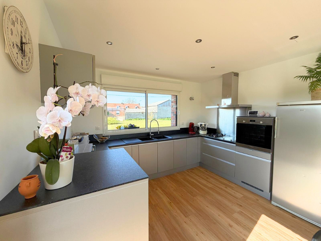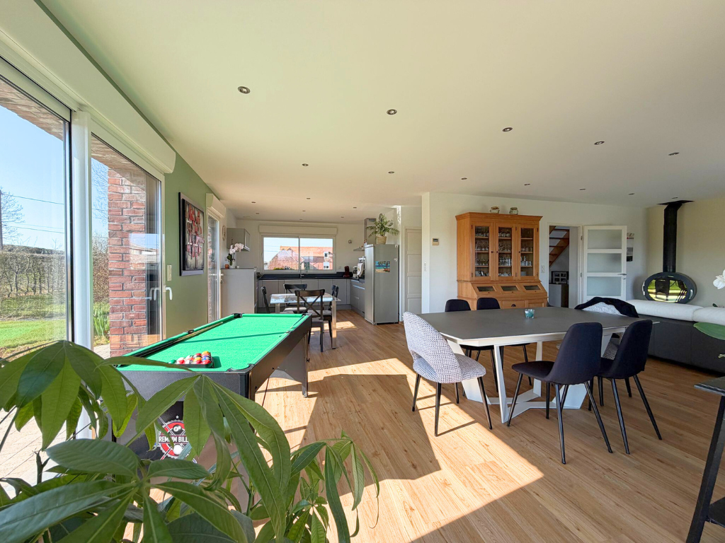 Une somptueuse pièce de vie avec de grandes ouvertures sur le jardin et une cuisine équipée ouverte où tout invite à partager.